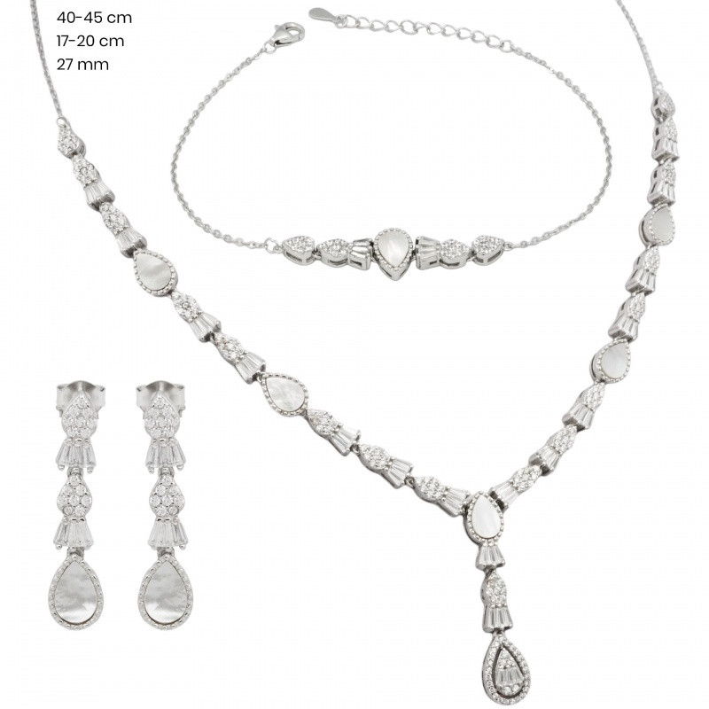 Ez a 925-ös Sterling ezüstből készült, ródiumozott bevonattal ellátott ékszer szett egy igazi mestermű, amely három darabból áll: nyakékből, karkötőből és fülbevalóból.