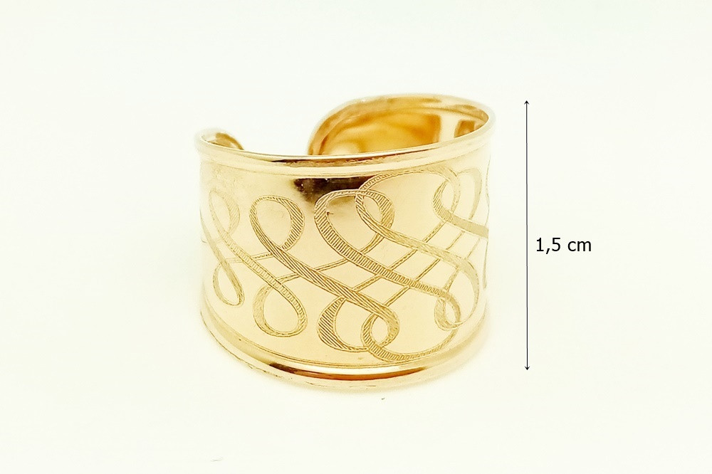 Magyarországon készült arany palást gyűrű végtelen vonal vésettel. A kecses vésett vonal kacskaringózva fedi be a gyűrű felületét, lágyságot, nőiességet sugall.