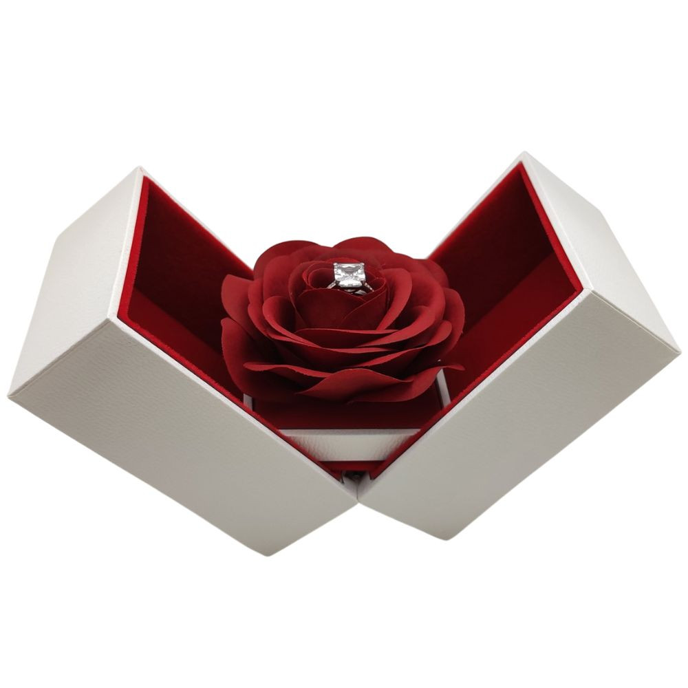 Ez a vörös rózsa alakú ékszerdoboz a kifinomult elegancia és a romantikus gesztus tökéletes megtestesítője. A doboz külső burkolata bársonyosan puha, részletgazdag szirmai valósághű hatást keltenek. Amikor kinyitod, egy gyönyörűen formázott szirmos belső tárul eléd, amelynek közepén egy különleges hely vár a gyűrűre. Ideális választás eljegyzési gyűrű bemutatására, vagy meglepetés ajándékként bármilyen romantikus alkalomra.