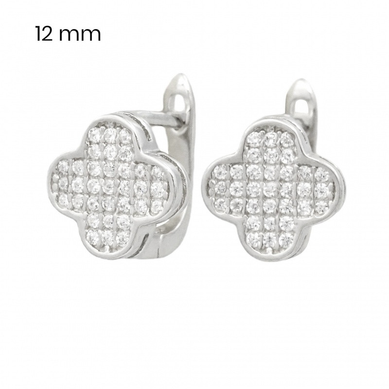 Ez a négylevelű lóhere formájú ezüst fülbevaló tele van apró, csillogó kövekkel, amelyek minden fényben szikráznak és ragyognak. A lóhere motívum lágy eleganciát sugároz, míg a sok apró kő csillogása egy kis luxust ad az ékszerhez. A részletes kidolgozás és a kövek tökéletes elhelyezése különleges ragyogást kölcsönöz az ékszernek, így minden mozdulatnál szinte életre kel. Ez a fülbevaló kiváló választás azoknak, akik szeretik a természet ihlette, mégis kifinomult ékszereket, amelyek elegáns megjelenést biztosítanak.