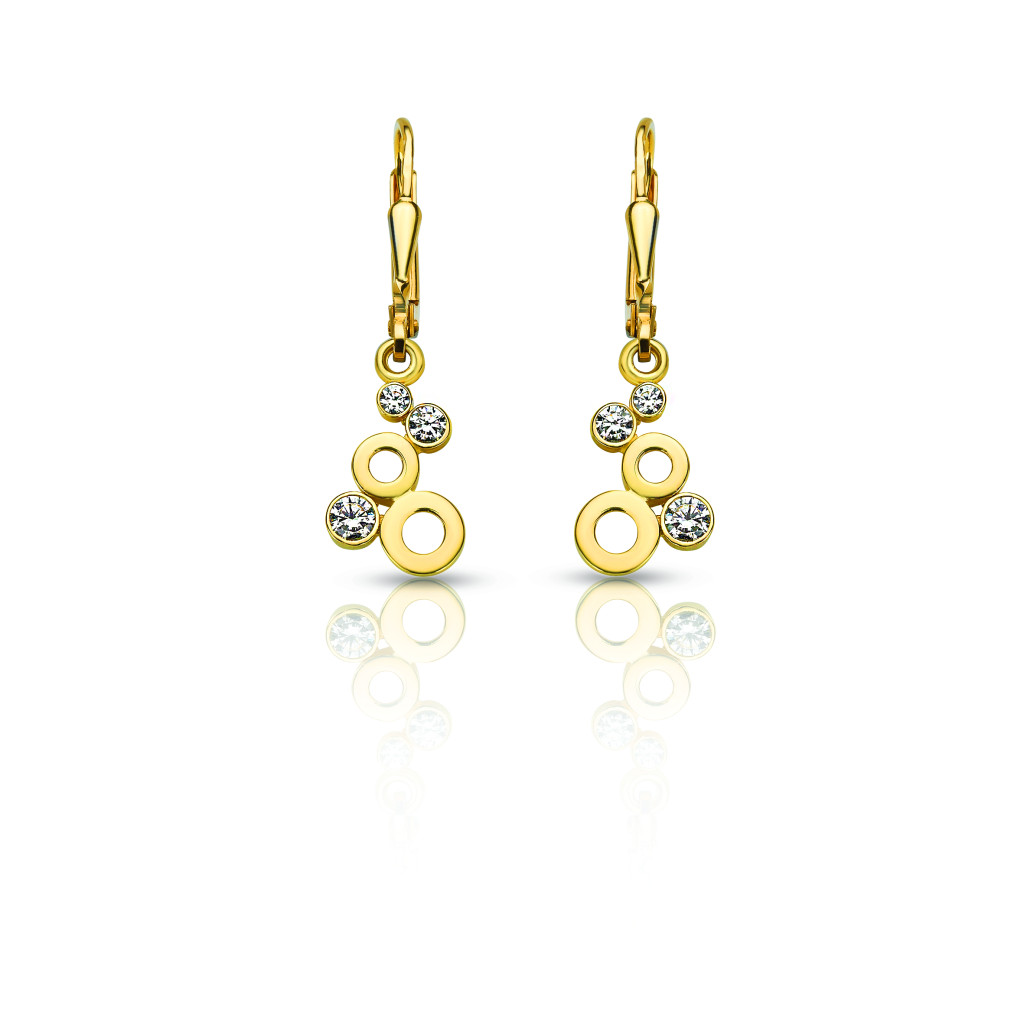 Letisztult, modern geometrikus arany fülbevaló, öt kis körrel, melyek finoman érintkeznek.