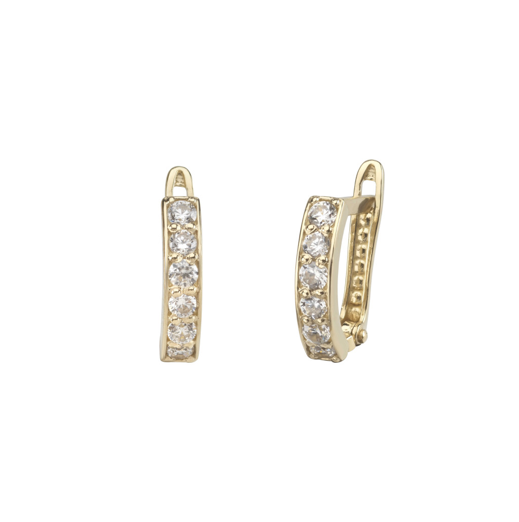 Ragyogó sorköves arany fülbevaló, 14 karátos sárgaaranyból, francia záras kivitel.