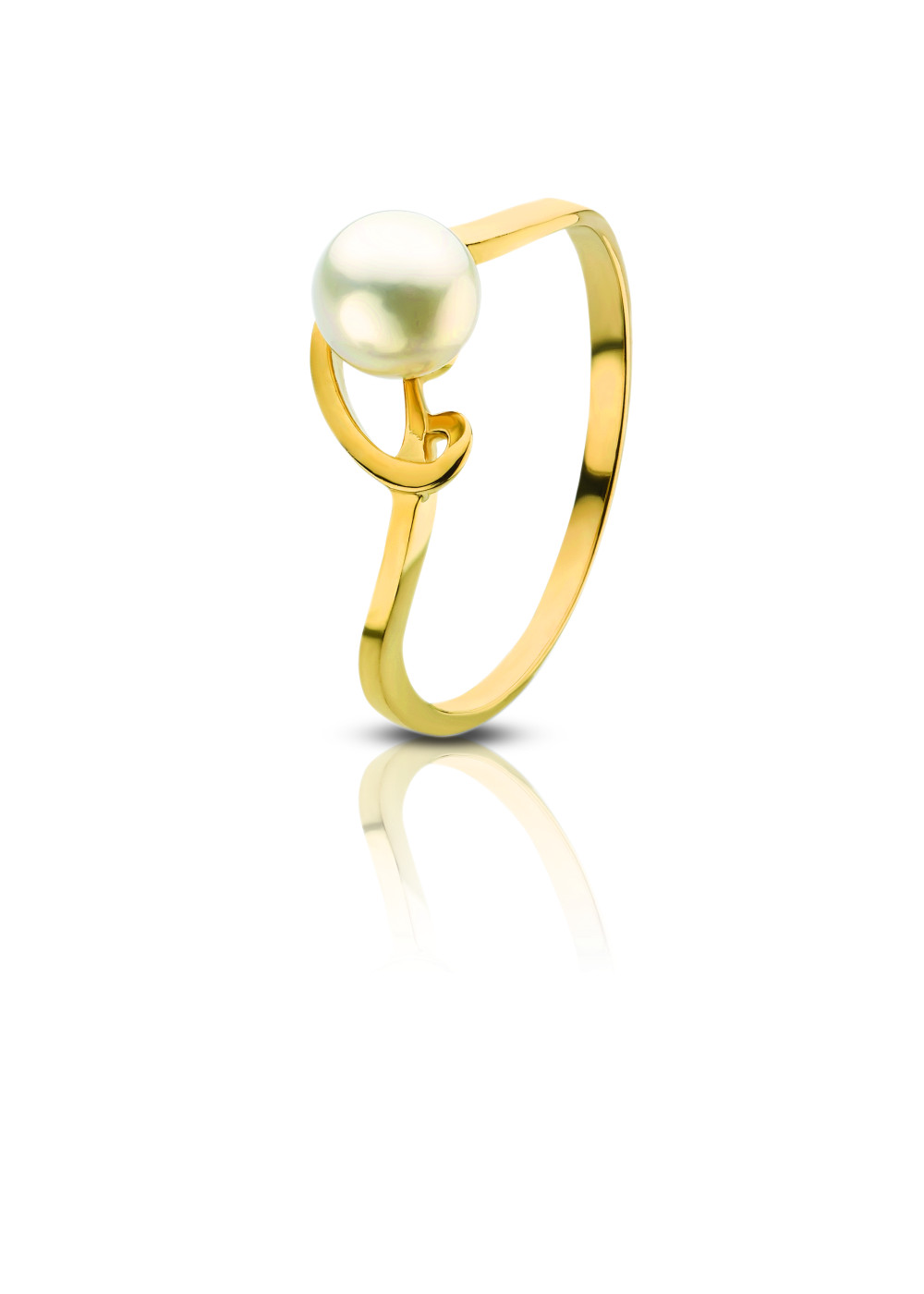 Csodaszép aszimmentrikus 14 karátos arany gyűrű édesvízi tenyésztett gyönggyel. A szolid gyöngyöt lágyan öleli körbe az arany gyűrű szára, kecsességet és nőiességet csempészve ebbe a különleges ékszerbe.