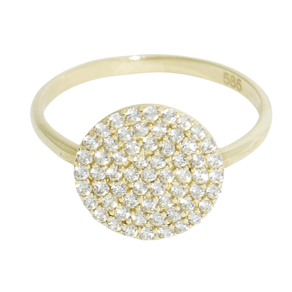 Káprázatos sárga arany gyűrű, melynek látványos fejét csillogó cirkónia kövekkel rakták ki.