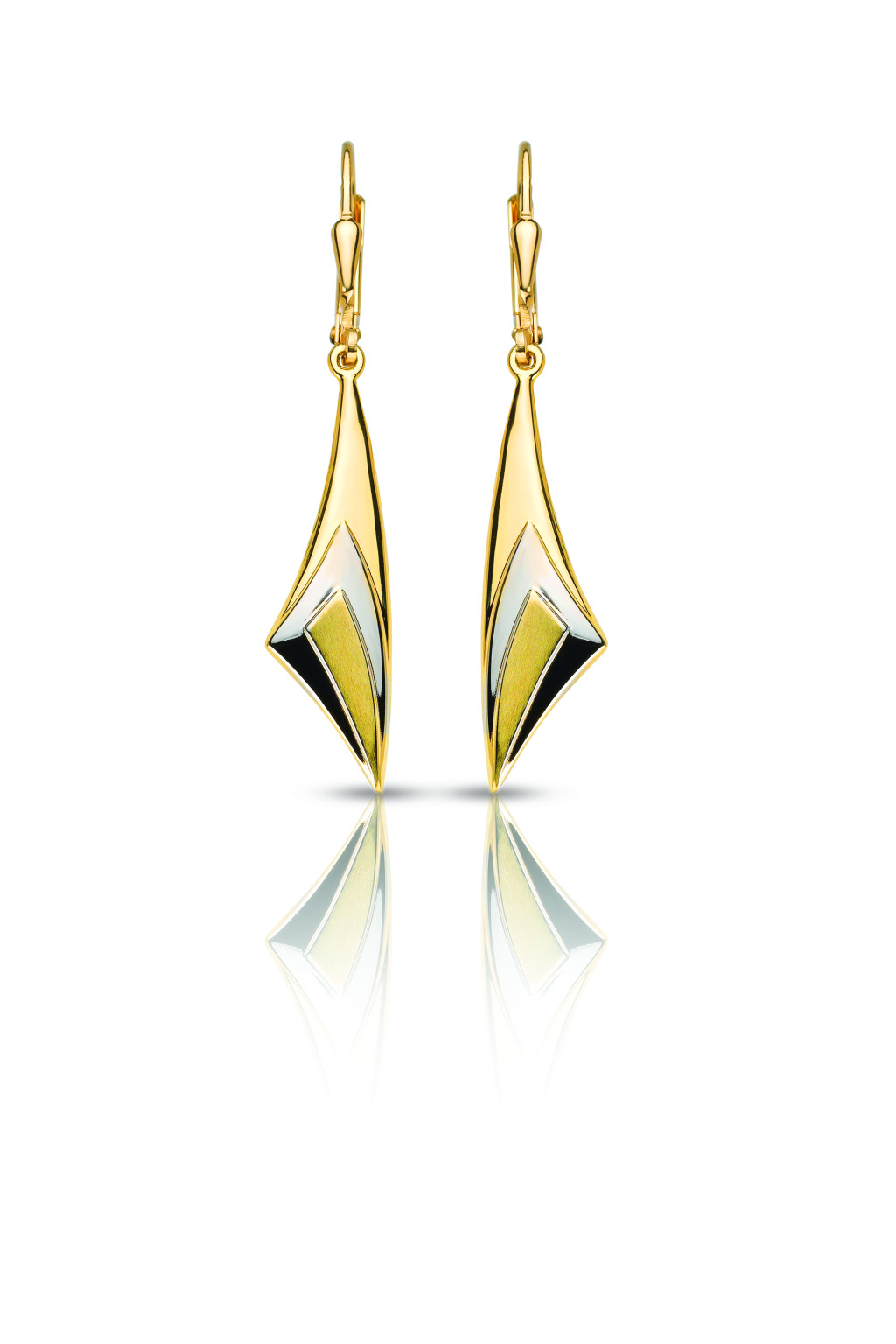 Letisztult, modern, hosszított háromszög formájú 14 karátos arany lógós fülbevaló.