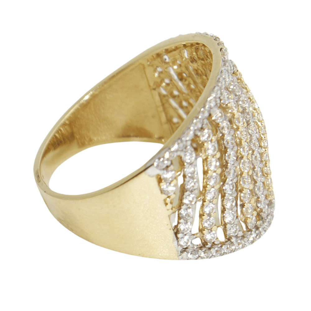 Látványos arany gyűrű, hullámszerűen fodrozódó részletekkel, melyen ragyogó cirkónia kövek idézik meg a hullámzó vízen megcsillanó napfényt. Elbűvölő kiegészítője lehet egy sötétebb alkalmi ruházatnak.