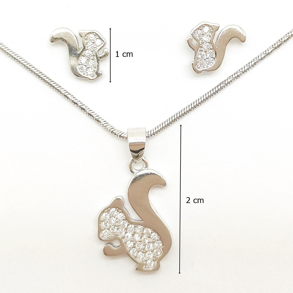 Ezüst mókus állatos ékszer szett cirkónia kövekkel díszítve, tartozéka egy beszúrós fülbevaló és egy bájos mókus medál. A lánc illusztráció, nem az ékszer része.