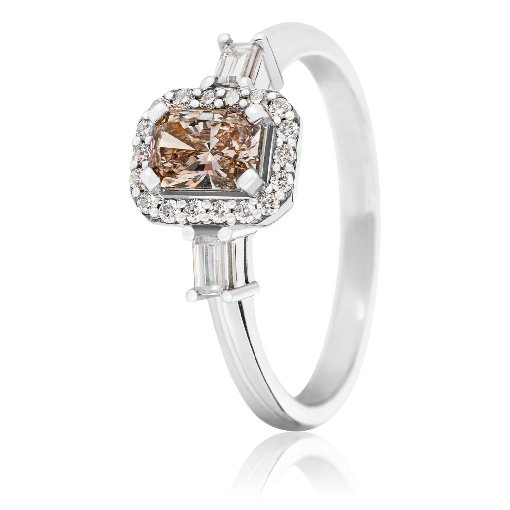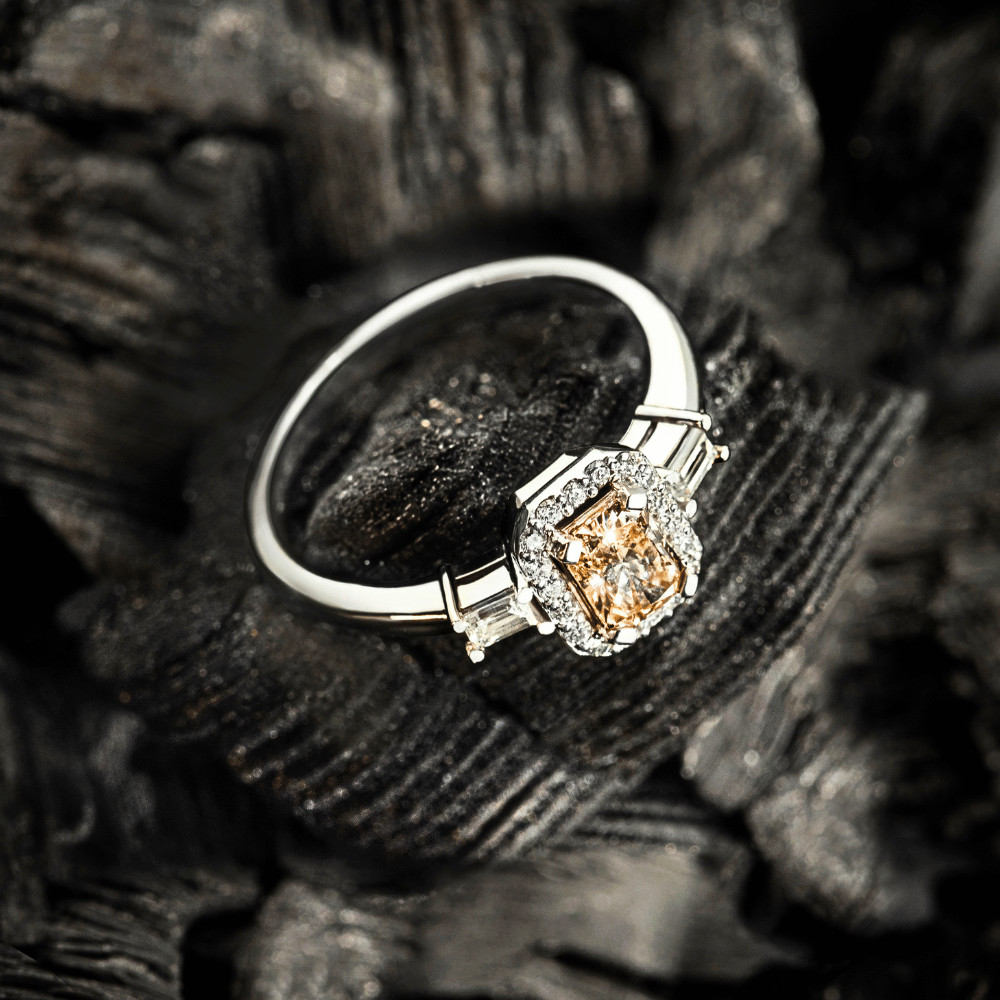 Letisztult harmónia, pezsgő ragyogással - Ez az egyedi tervezésű fehér arany gyűrű egy 0,411 karátos, négykarmos foglalatban ülő, elegáns pezsgőszínű (Champagne), baguette csiszolású gyémántot emel a középpontba. Az oldalán két darab, egyenként 0,1 karátos briliáns kő ragyog, míg a központi követ egy finoman körbeölelő glória hangsúlyozza: 18 apró, összesen 0,14 karát briliánssal. Az eredmény: lélegzetelállító fényjáték, ahol a melegség és az erő kéz a kézben járnak.