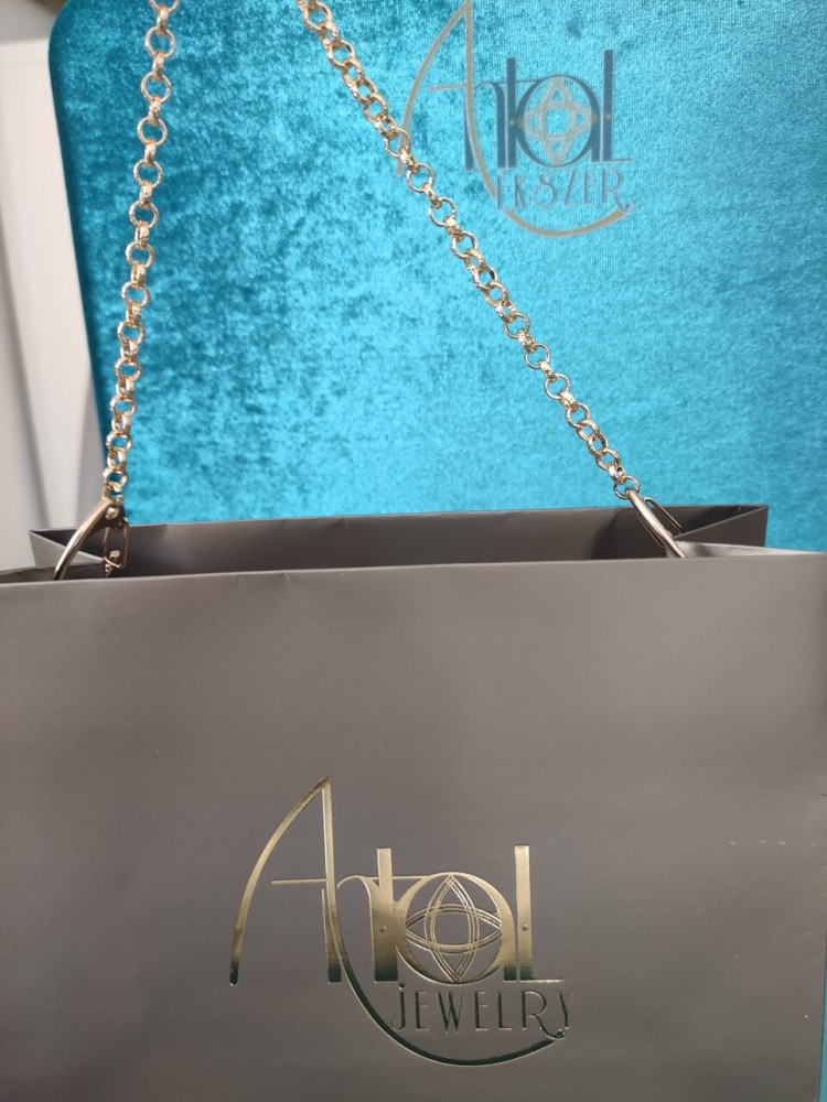 Ezüstszínű logózott ajándéktasakunk különlegessége, hogy fogantyúja a hagyományos szalagos megoldás helyett a logó feliratának arany színével megegyező aranyszínű láncból készült, így igazán stílusos kiegészítője lehet egy ajándék ékszernek.