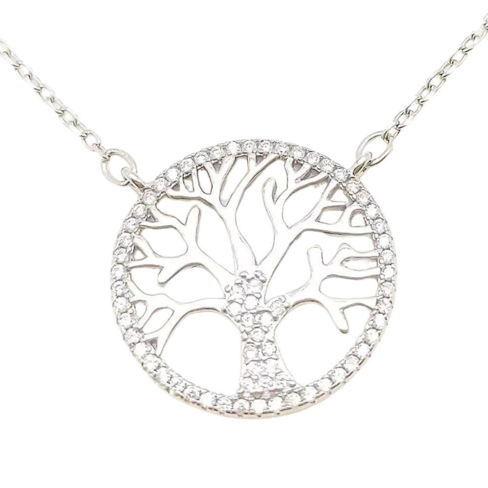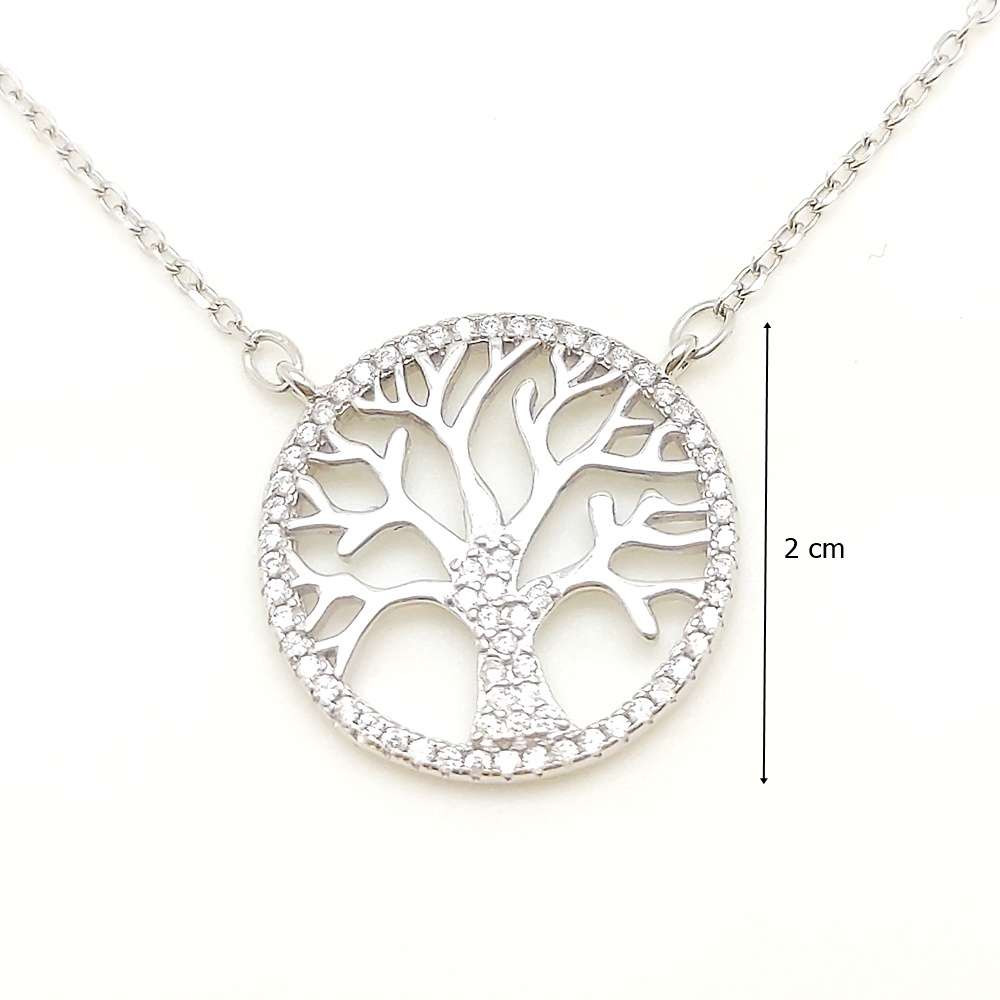 Az életfa motívumot jeleníti meg ez a csodálatos, ródiumozott ezüst (925) collier, az anker láncon lógó ágas életfa törzsét, valamint a medál körvonalát cirkónia kövekkel díszítették.