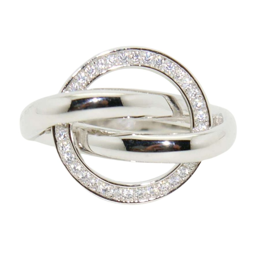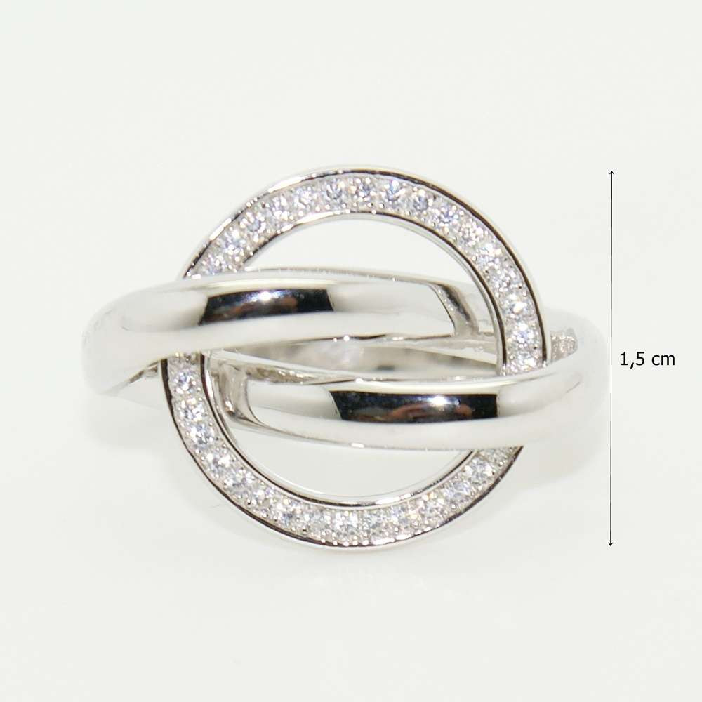 Ródiumozott ezüst gyűrű, különleges kialakítással. A gyűrű ezüst karikája két oldaról finoman átöleli a cirkónia kövekkel díszített középső elemet, így megjelenítve az összetartozást és az élet örök körforgását.