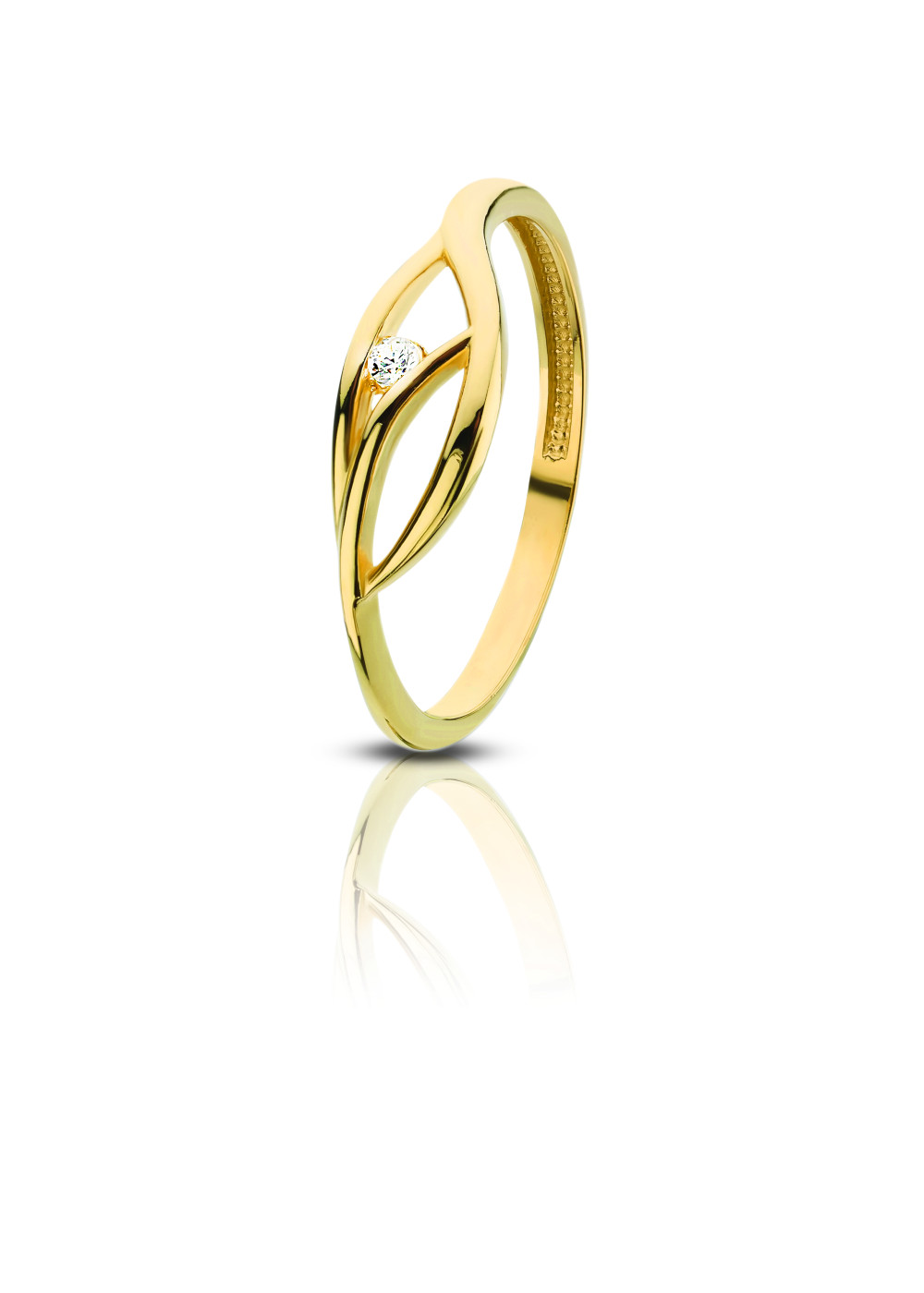 Stilizált levél formával díszített 14 karátos arany gyűrű, melyen egyetlen kis cirkónia kő csillog.