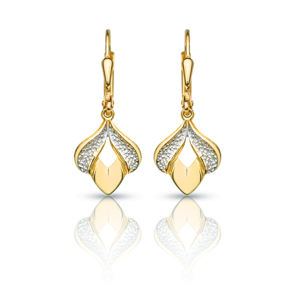 Egy fejjel lefelé fordított nyíló tulipánt idéz ez a sárga arany fülbevaló, melyet patentzárral rögzíthetsz a füledbe.